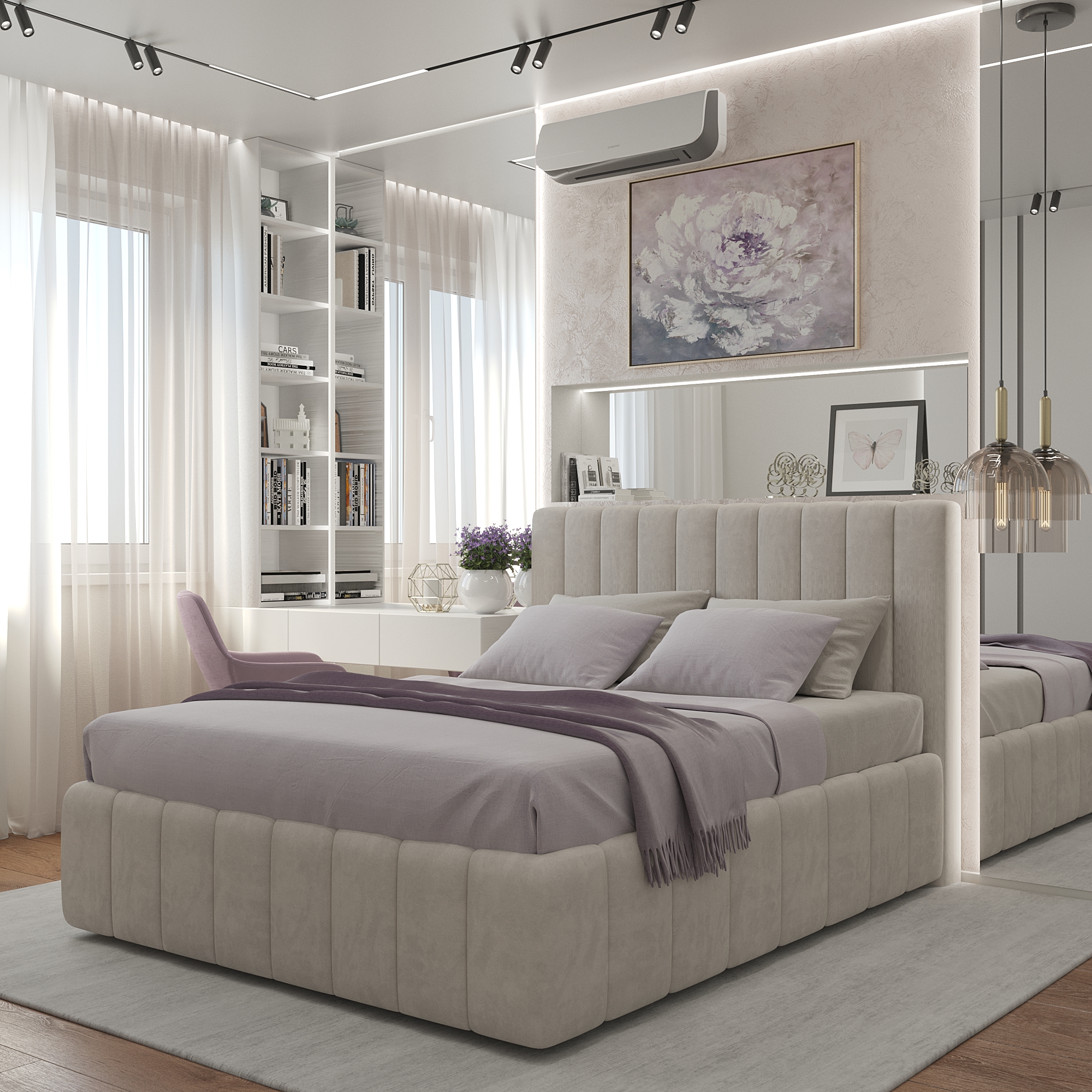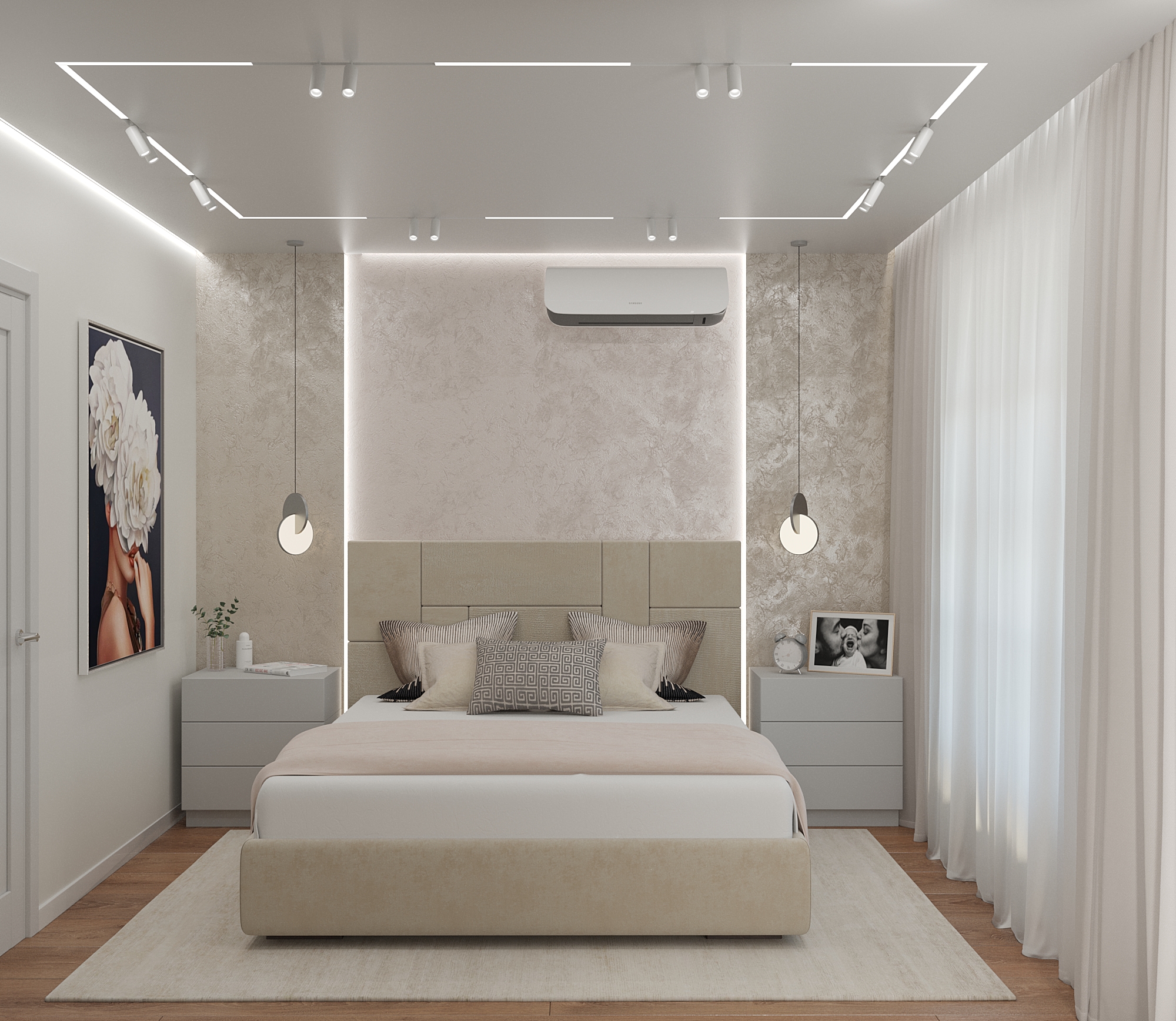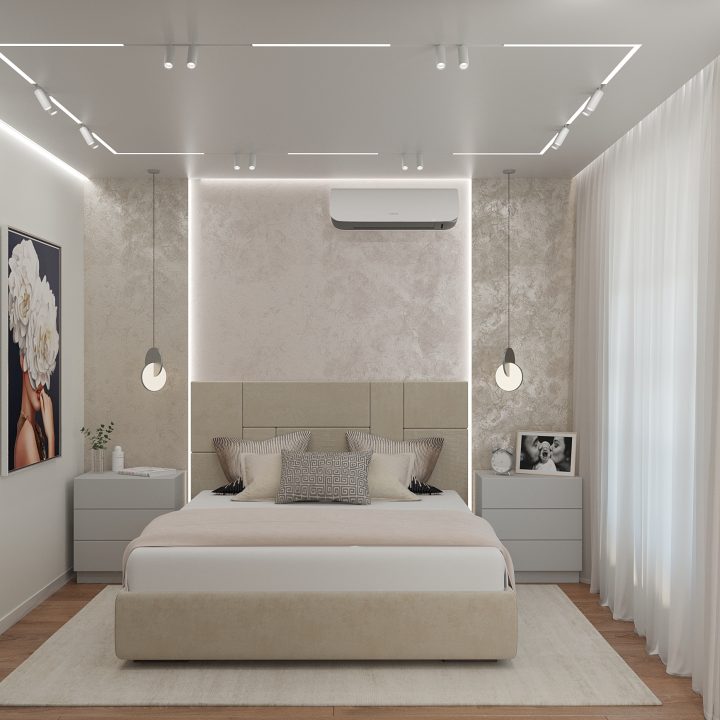 Вторая спальня – более классический вариант как по цветовому оформлению, так и по отделке. Фактурная штукатурка , напольное покрытие, прикроватные тумбы – все решено в спокойной серо-бежевой гамме, под которую подобрано и декор-решение кровати. Атмосферу сдержанности и лаконичности дополняют подвесные светильники и технологичные «световые линии» на потолке.
