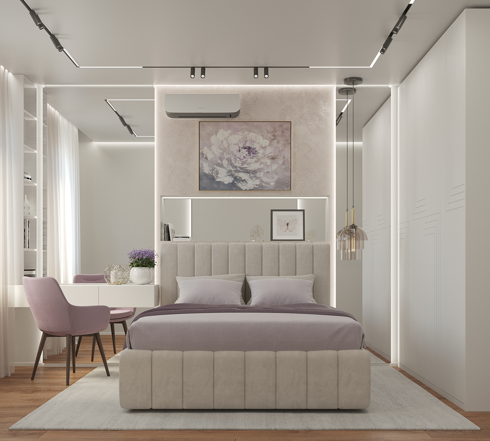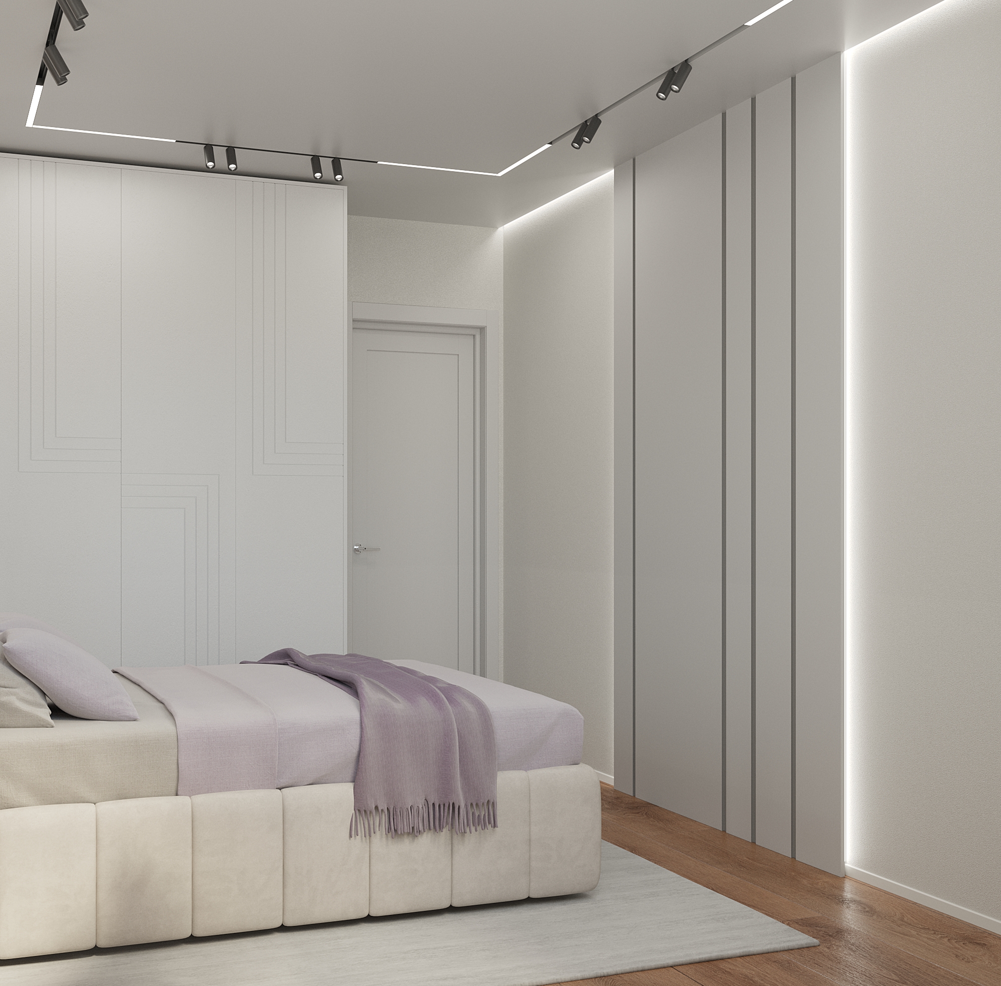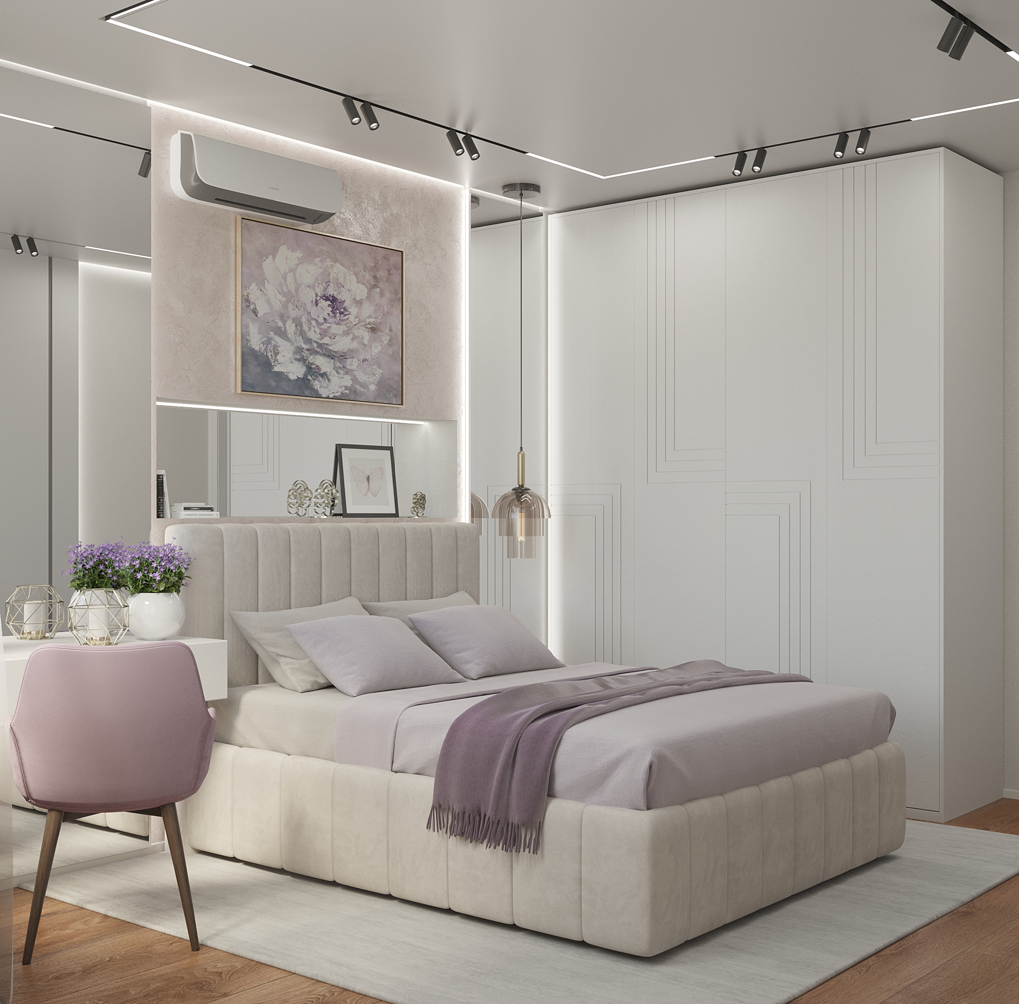 Вторая спальня – более классический вариант как по цветовому оформлению, так и по отделке. Фактурная штукатурка , напольное покрытие, прикроватные тумбы – все решено в спокойной серо-бежевой гамме, под которую подобрано и декор-решение кровати. Атмосферу сдержанности и лаконичности дополняют подвесные светильники и технологичные «световые линии» на потолке.