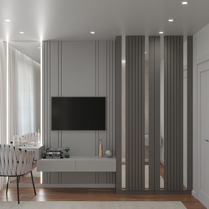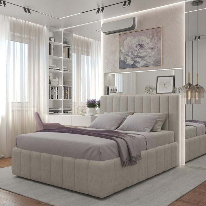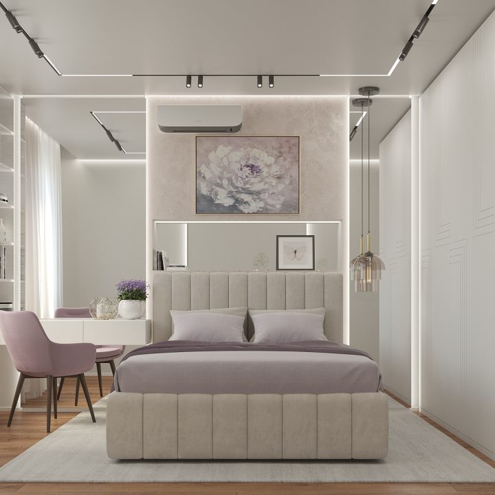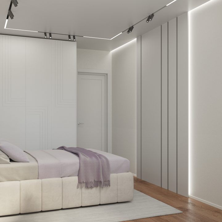 ООригинальность и лаконичный минимализм – главные черты, которые мы использовали в данном планировочном и стилистическом решении. Для реализации были выбраны светлые тона и акцент на современные технологические решения, касающиеся освещения. Цель – максимальное визуальное расширение пространства и комфорт высшего уровня. Особое внимание было уделено интерьер-дизайну спален – в квартире их две. Для первой было выбрана более «холодная» концепция. Зеркальная стена, фактурные узоры оформления стен и спокойные пастельные тона – оригинальное сочетание «прохладных» оттенков (фиолетового, серого, светло-бежевого) и отраженного света превращает спальню в настоящий эталон современного стиля.