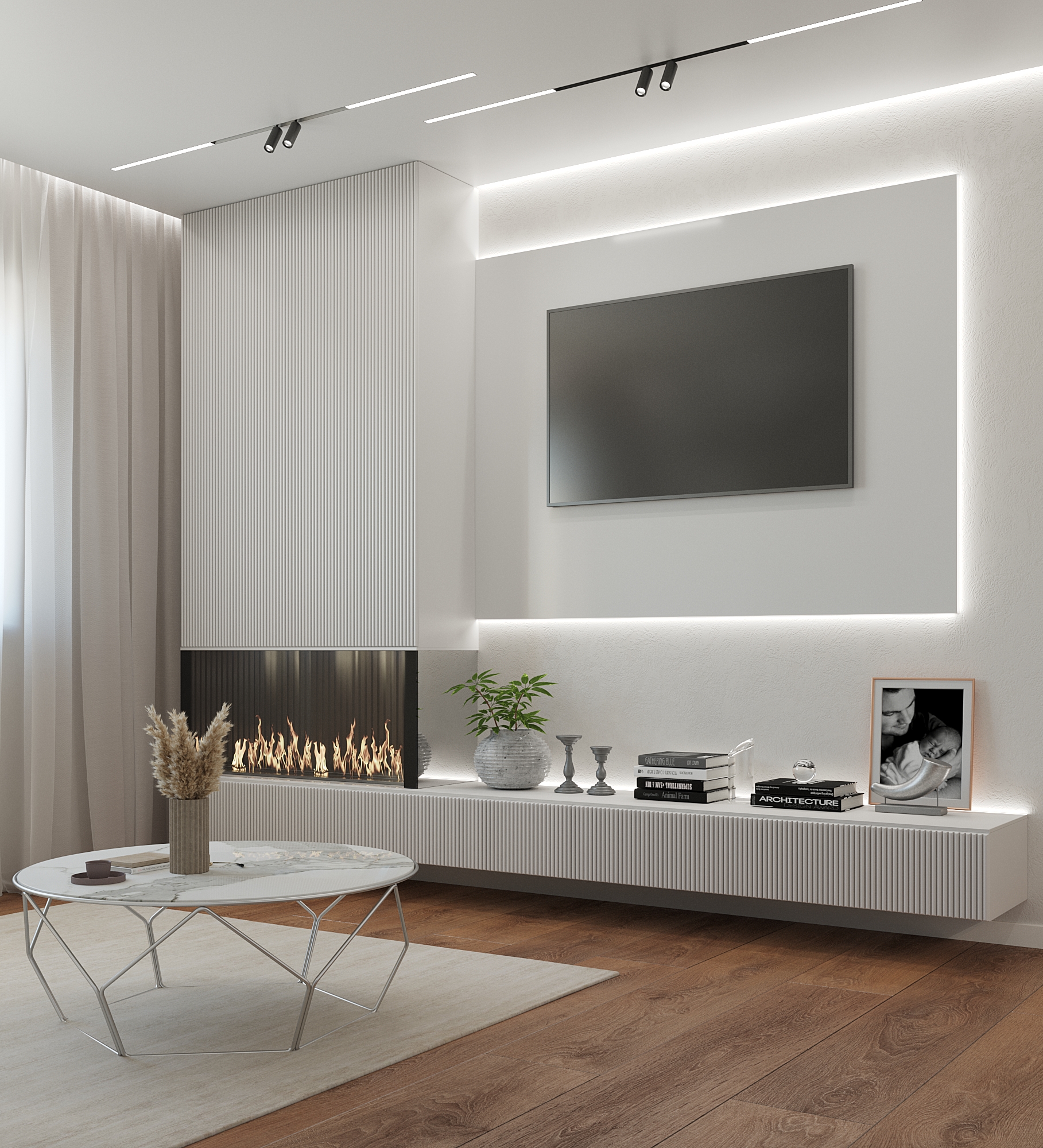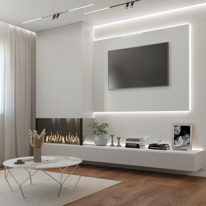 Контурный свет и подсветка стенки создают эффект расширенного пространства, а смещенный влево камин создает оригинальный контраст с общим акцентом на белый цвет. Это создает оригинальный визуальный ряд, который объединяет в себе сразу несколько стилистических решений. В сочетании с регулируемым по расположению потолочным светом и оригинальным журнальным столиком, общая картина выглядит стильно и действительно безупречно.