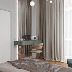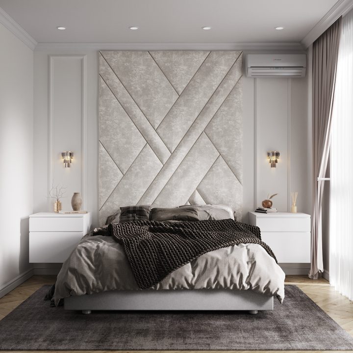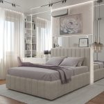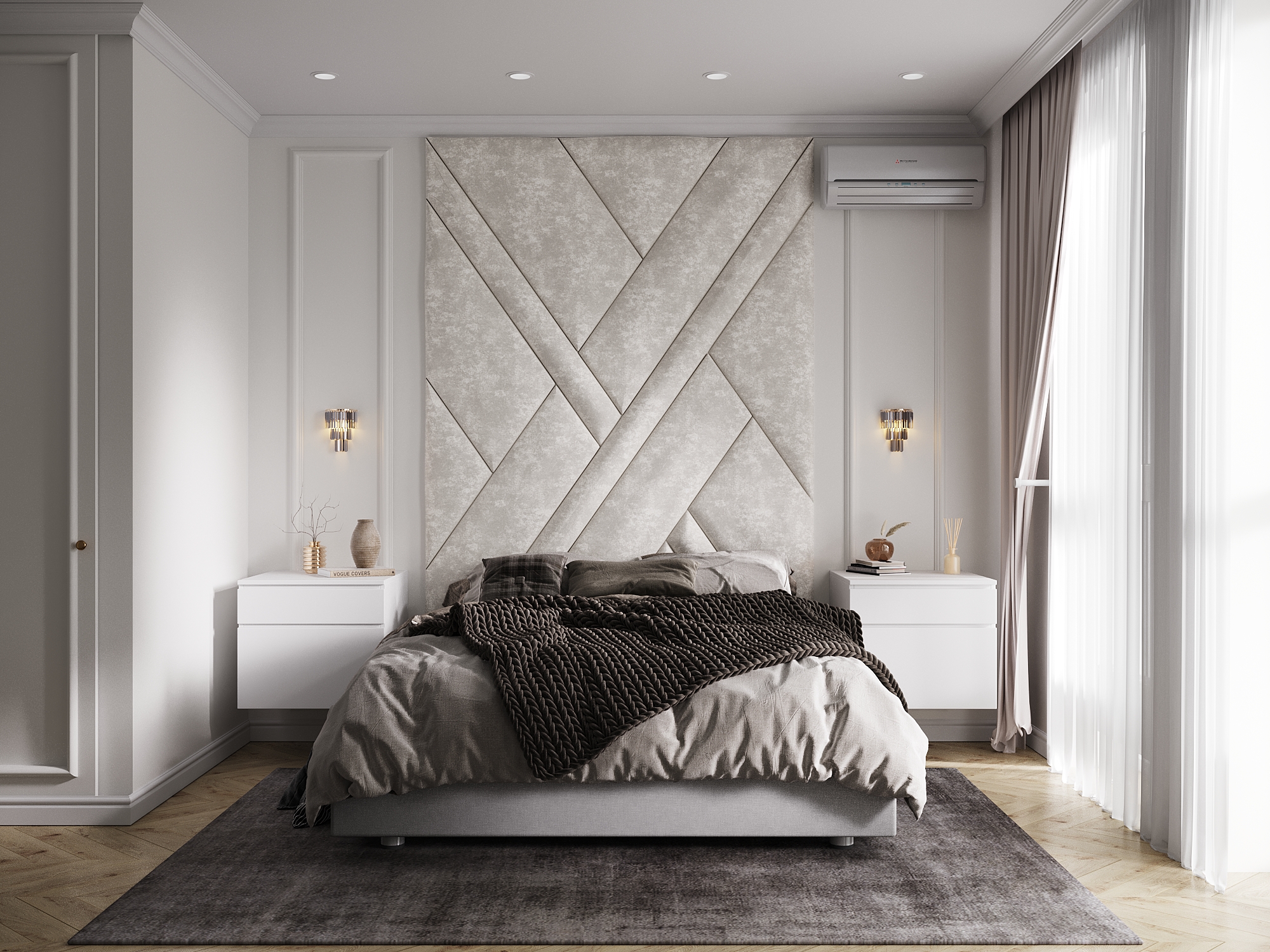Спальня должна быть не только стильно оформленной с дизайнерской точки зрения, но и обеспечивать максимальный комфорт сна и отдыха. Следуя принципу оптимальной организации пространства, мы оформили спальную зону в духе лаконичного минимализма. Небольшие бра на стенах, подвесные прикроватные тумбы, фактурное изголовье, уходящее вверх до потолка, общее освещение при помощи круглых точечных светильников – ни одной лишней детали и идеальный комфорт.