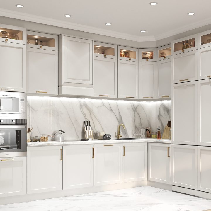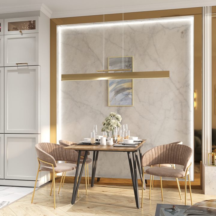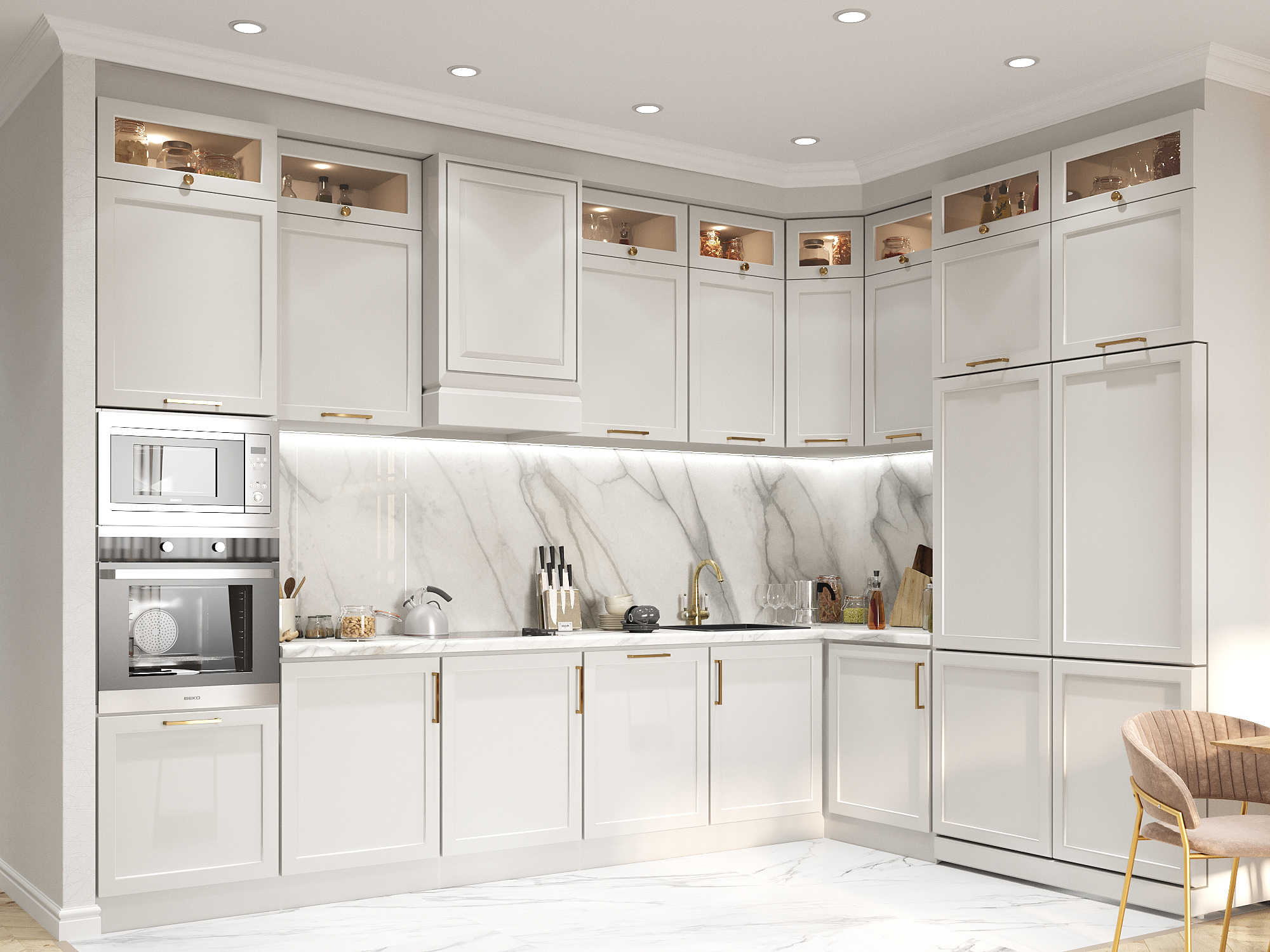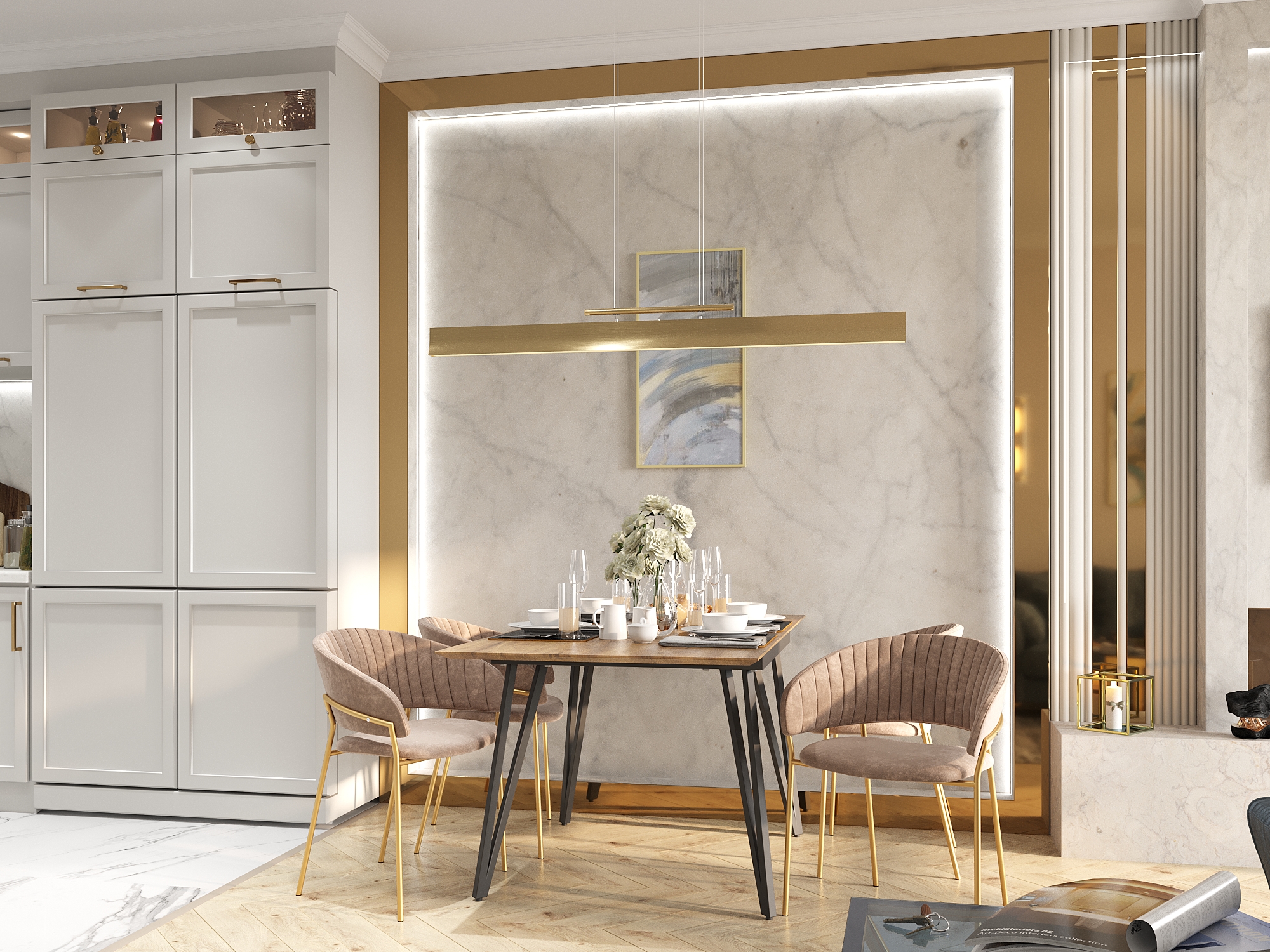 Присущая современному стилю лаконичность не предусматривает размещения лишних предметов и декораций. Именно в такой концепции решена кухня: белоснежный гарнитур включает колонну для встроенной техники и предусматривает внутреннюю подсветку рабочей зоны, оформленную «фартуком», имитирующим текстуру натурального мрамора. Сочетание таких дизайнерских приемов органично встраивает современную функциональность в классический формат кухонной зоны.