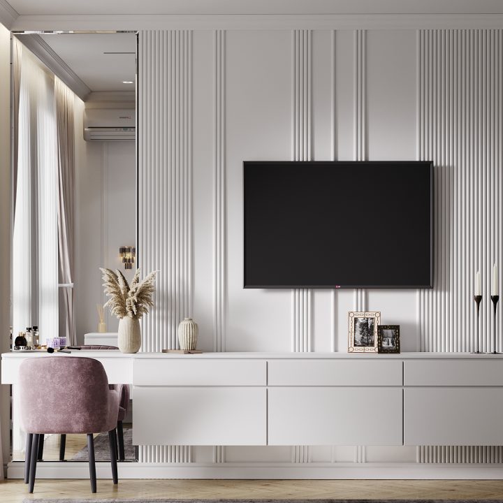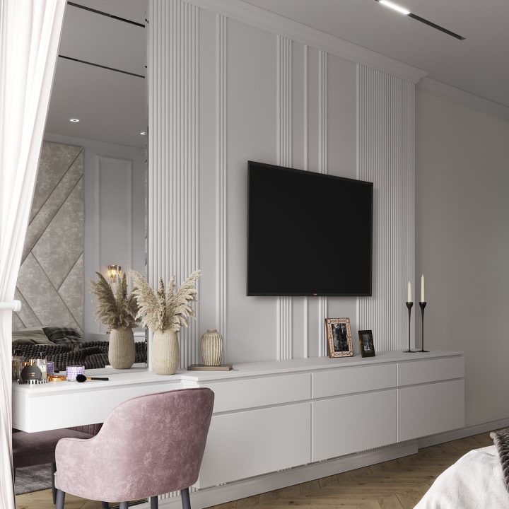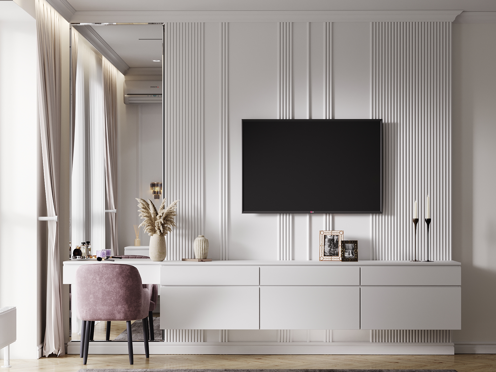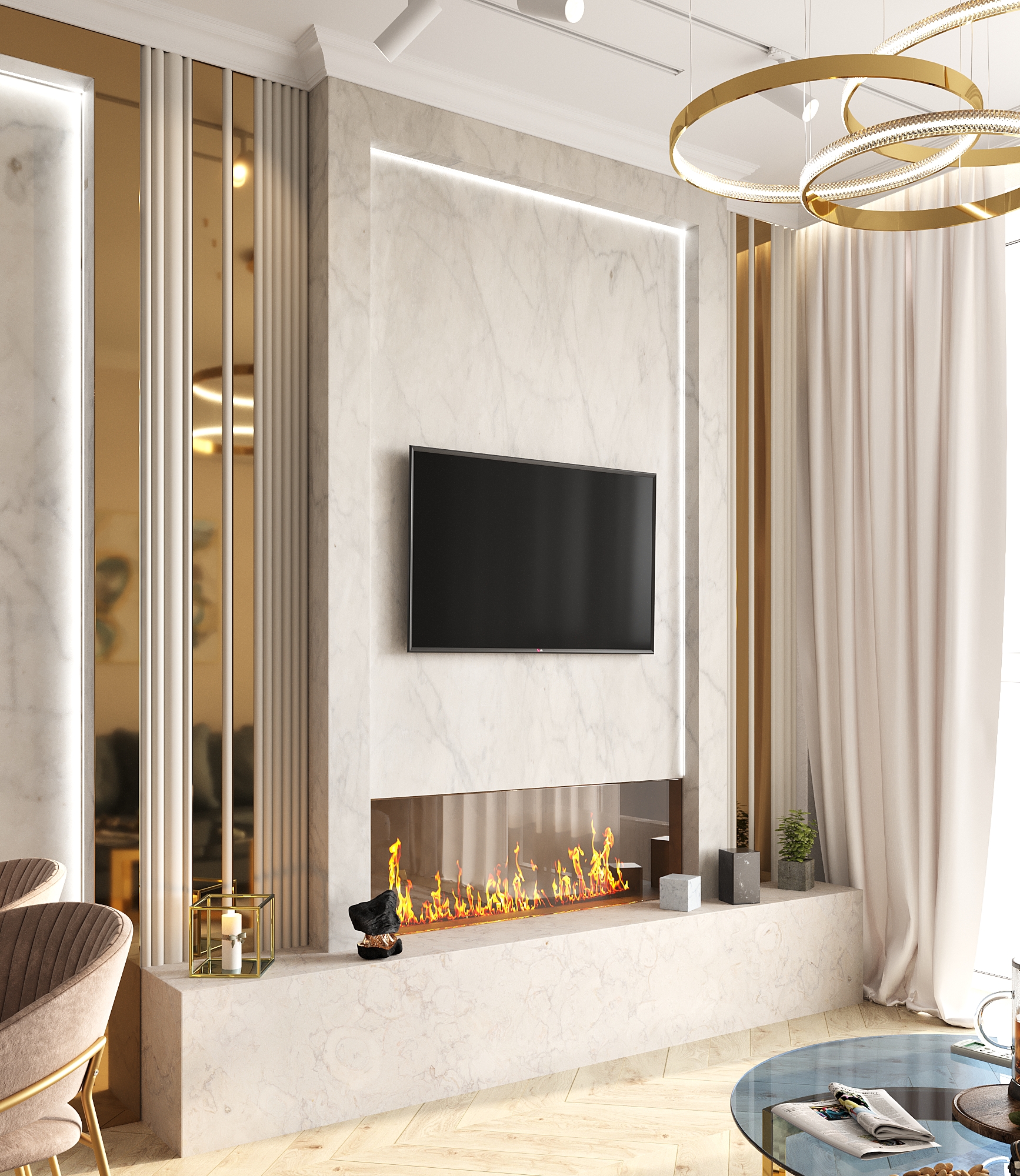 Современная классика лишена излишней чопорности и максимально функциональна. Гармония, комфорт и легкость – ее отличительные черты. Зеркальные элементы, тонированные под золото, в гостиной гармонично сочетаются с объемным ТВ-постаментом, дополнительно оснащенным стильным камином. В белой цветовой гамме особая роль отведена источникам света. Тщательно проработанная схема освещения включает стильные подвесные LED-светильники, регулируемые точки освещения и внутреннюю подсветку объемных элементов стены.